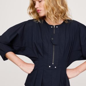 A shirt that says \”I got this\”. We reimagined utility details to create a twist on the classic button placket, seen here in a balloon-sleeve top cut from our stretch-cotton ripstop fabric, with its signature grid texture.