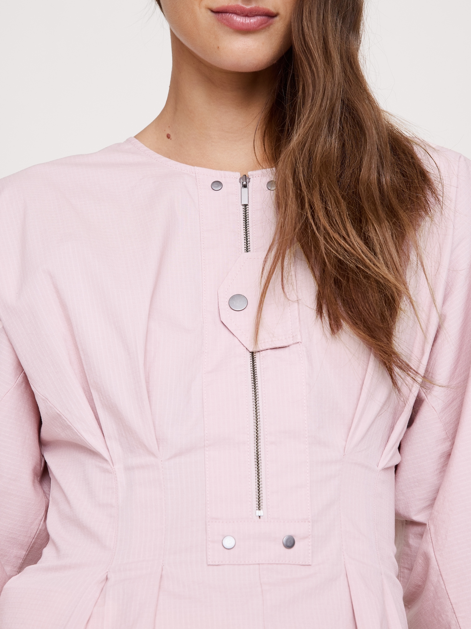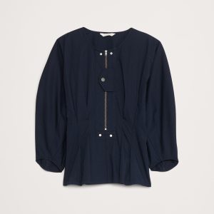 A shirt that says \”I got this\”. We reimagined utility details to create a twist on the classic button placket, seen here in a balloon-sleeve top cut from our stretch-cotton ripstop fabric, with its signature grid texture.