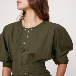 A shirt that says \”I got this\”. We reimagined utility details to create a twist on the classic button placket, seen here in a balloon-sleeve top cut from our stretch-cotton ripstop fabric, with its signature grid texture.