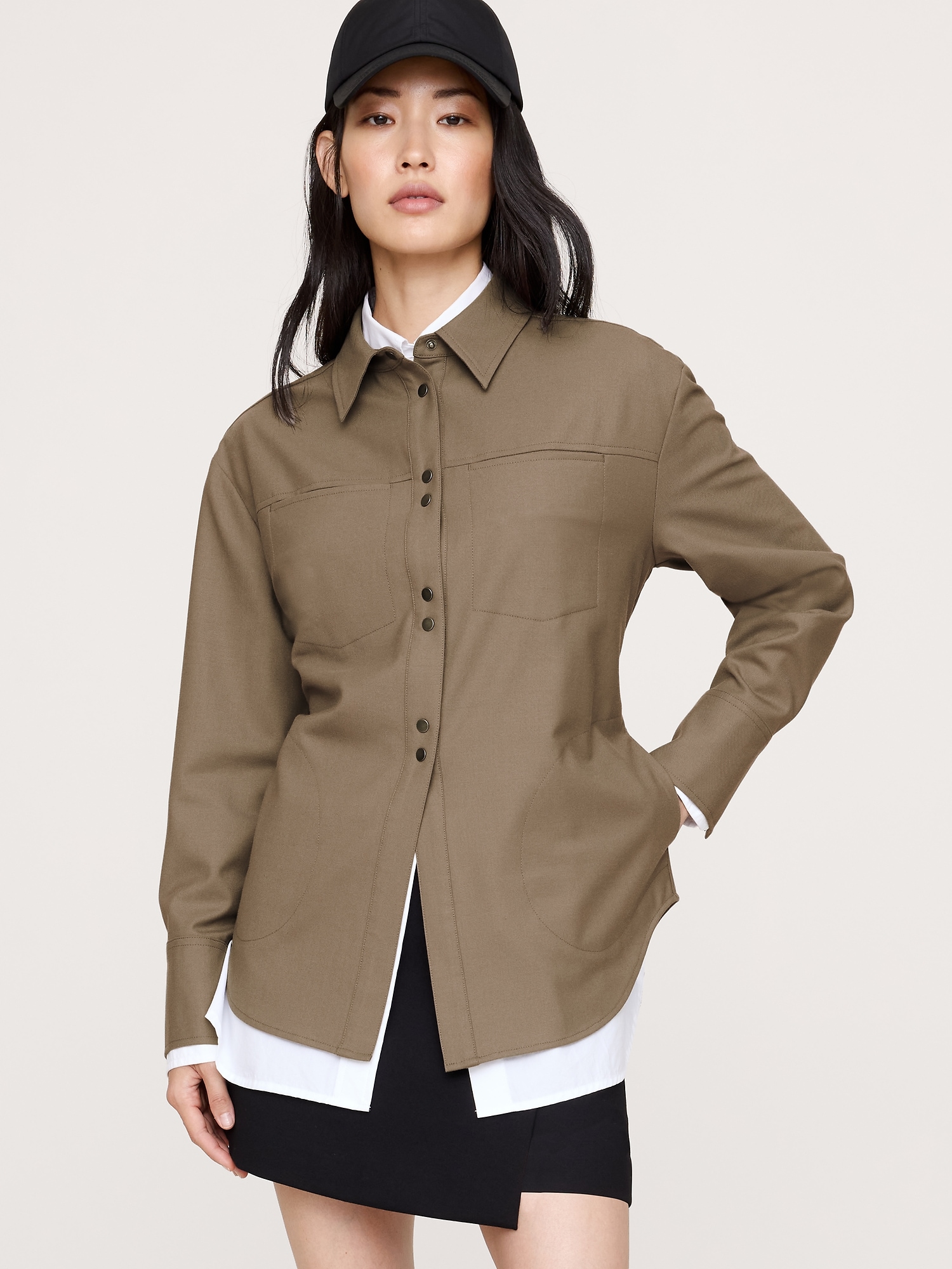 A very cool shirt. We cut this one in an oversized fit from a wool-blend flannel and added a drawstring detail at the back to define your waist.