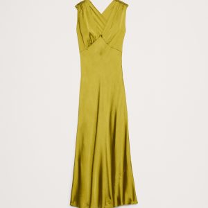 Party in the back. This stretch-satin dress is all about the details: a v-neck, flattering ruched bodice, open back, and wide crossover straps. In place of a zipper, our designer added a delicate drawstring detail for a custom fit.