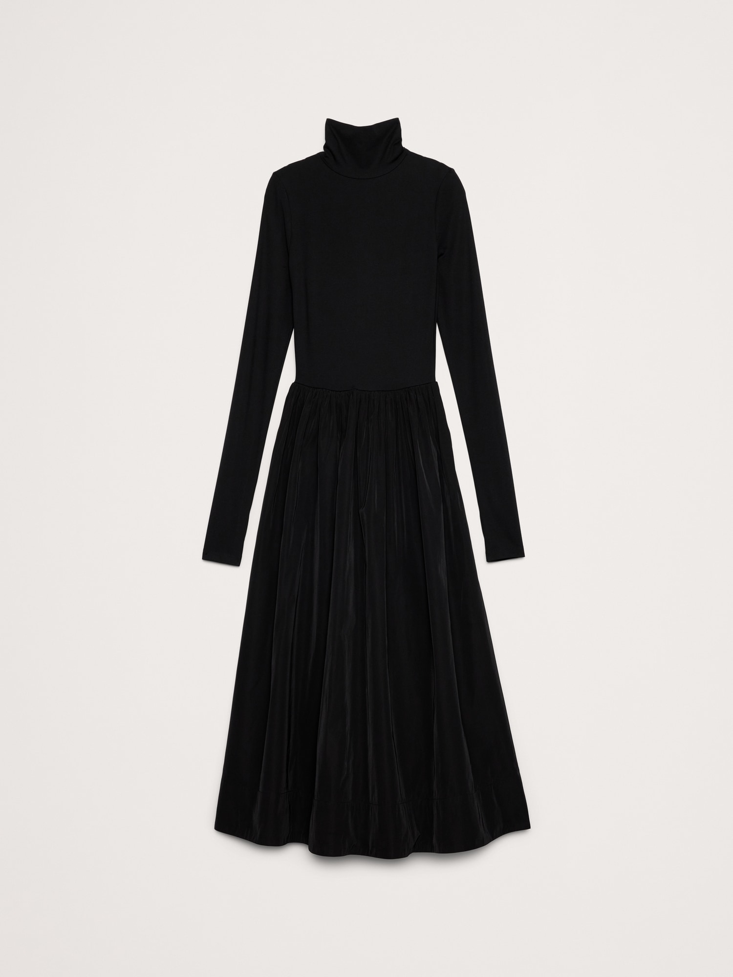 This maxi dress combines two favorites: a sleek knit jersey for the bodice and a full, taffeta skirt. Plus, we made the sleeves extra-long and added thumbholes just for fun.