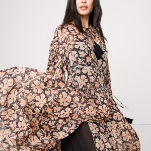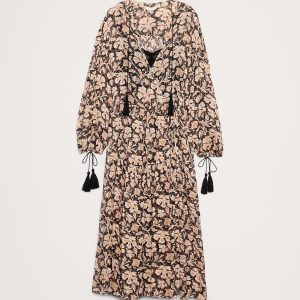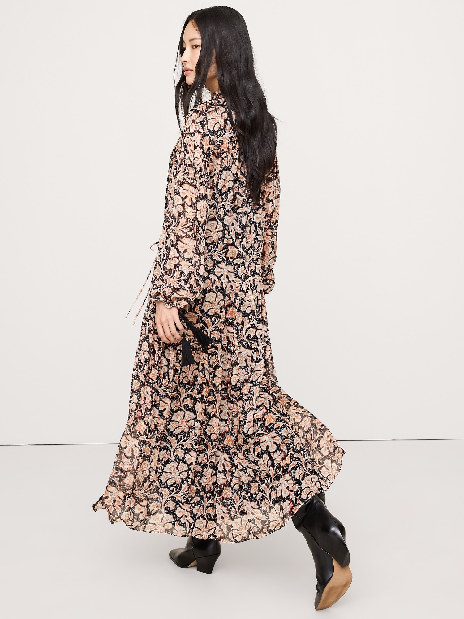 Look closely: this tiered maxi dress is cut from lighter-than-air chiffon with subtle, metallic lurex stripes. Plus, we added a camisole slip lining and tassels at the collar and cuffs.